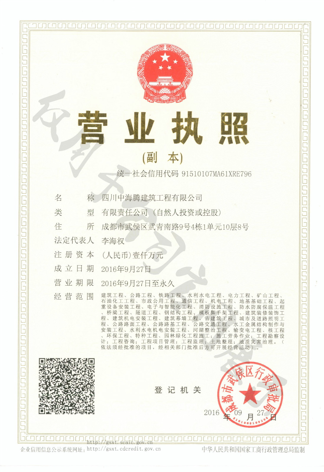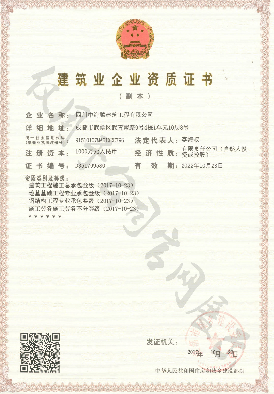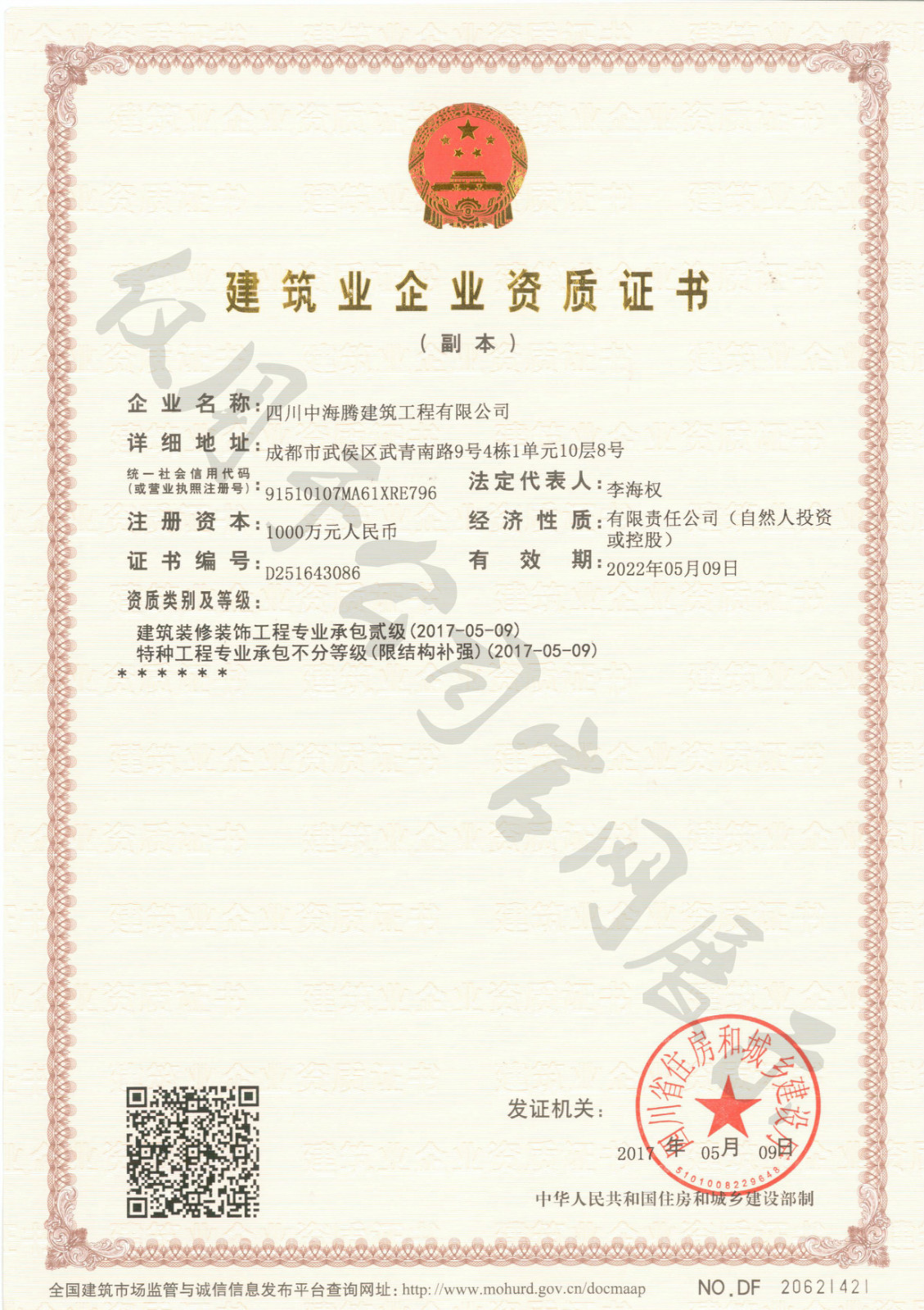 四川中海騰建筑工程有限公司是以結構加固工程為主,具有特種加固、鋼結構工程三級、房屋建筑工程三級、裝飾裝修工程二級、地基基礎處理工程等資質的一家綜合型建筑企業。